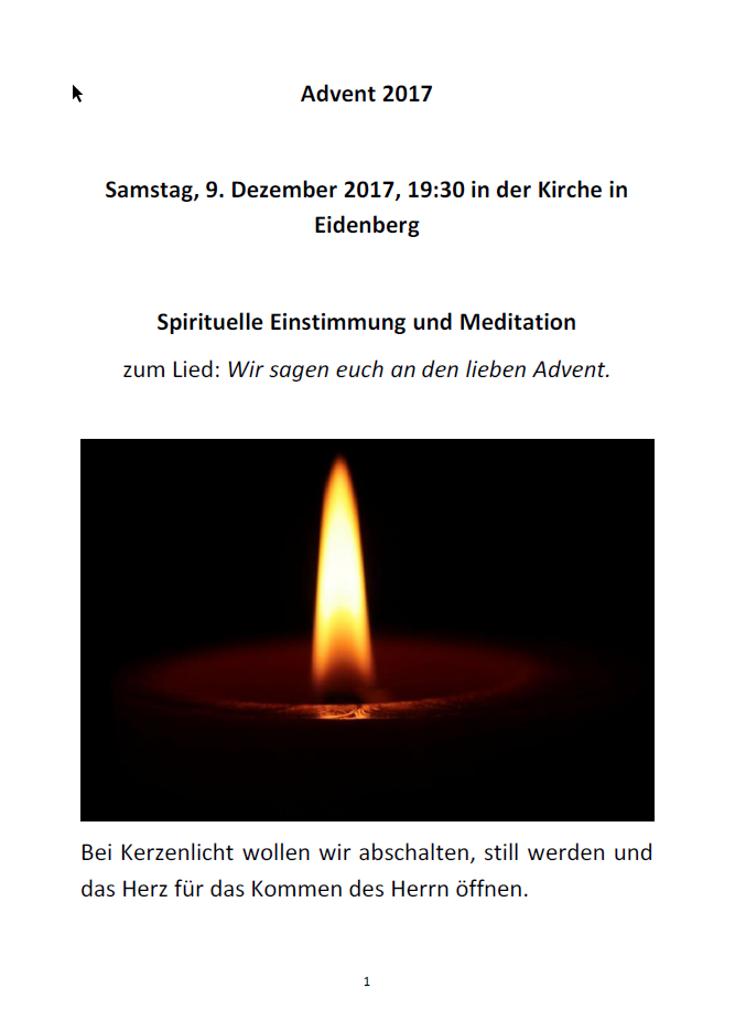 Wir laden Euch alle recht herzlich zur Familienmesse am 1. Adventsonntag, den 3. Dez. 2017 um 9.45 Uhr in die Pfarrkirche Eidenberg ein!
