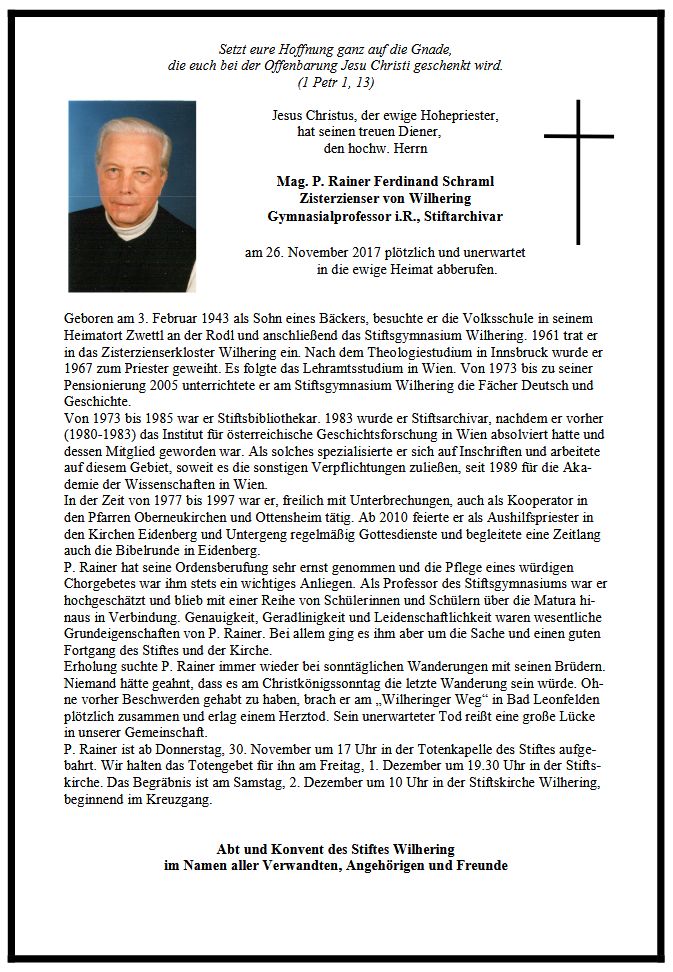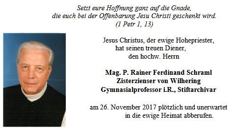 Mag. P. Rainer Ferdinand Schraml, Zisterzienser von Wilhering, wurde am Sonntag, 26. November 2017, im 75. Lebensjahr plötzlich und unerwartet in die ewige Heimat abberufen.