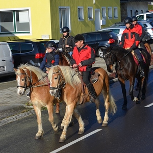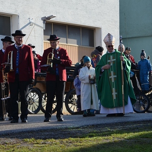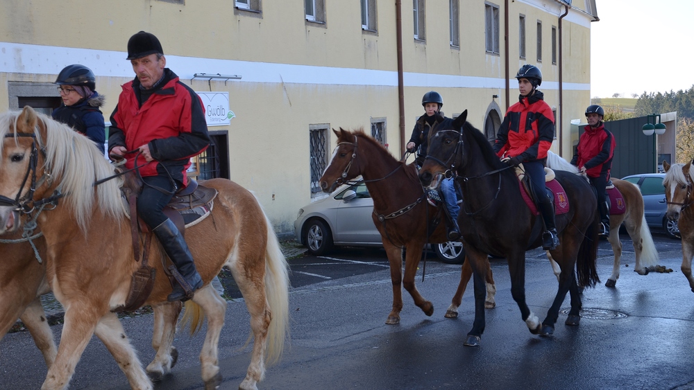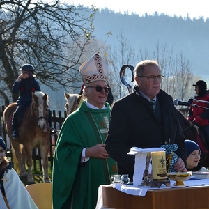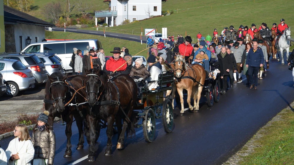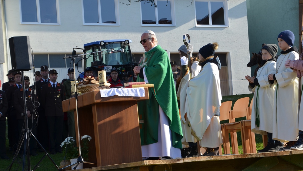 Der Althochmeister ging mit den Ministranten durch die Reihen der Pferde, um sie zu segnen. Die Feuerwehrburschen und Mädchen verteilten geweihte Brote an die rund 40 Pferde.